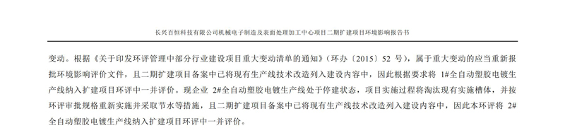 根據要求我公司對長興百恒科技有限公司二期擴建項目環評報告書進行全本公示發布日期:2022/9/26 類別:公司新聞 瀏覽量: 2643 根據《浙江省建設項目環境保護管理辦法(2018年修正)》及相關要求,我公司對長興百恒科技有限公司機械電子制造及表面處理加工中心項目二期擴建項目環境影響報告書進行全本公示